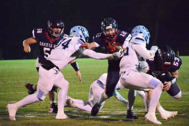 Dakota Ridge took the opening kickoff, driving down to Broomfield’s 1-yard line. However, on fourth-down Dakota Ridge junior Landon Kalsbeck was stopped just short of the goal line to turn the ball over on downs.