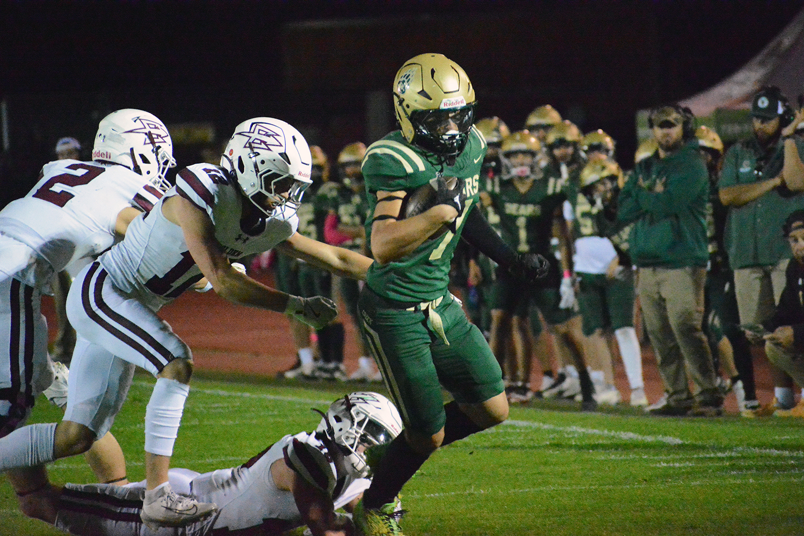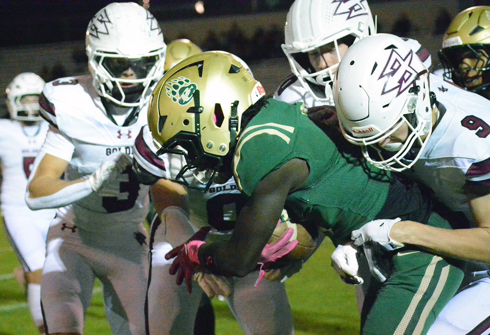 Meier had scoring runs of 7, 20, 8 and 9 yards over the span of about 12 minutes through the third and early fourth quarter to push Golden’s lead to 34-7 with 7:30 left in the final quarter. The junior only had one rushing touchdown on the season coming into the game against Bear Creek.