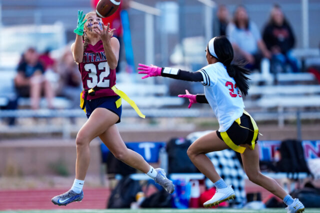 (Brent Murphy/BrentMurphyPhoto.com) Legacy flag football’s undefeated season is intact after the Lightning got a 31-6 win over Mountain Range on Wednesday. Full gallery via Brent Murphy Share Flag football Legacy Mountain View