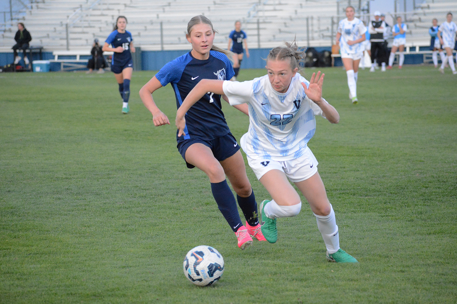 The goal in the opening minutes was a prime example of what Coach Morwood was looking for. Ralston Valley sophomore Josie Gregerson won a 50-50 ball that senior Mia Alfaro corralled and charged toward the net. Alfaro’s centering pass gave both Evilyn Morwood and Sabus a scoring chance. Sabus got a foot on the ball and knocked it past Valor junior goalie Grace Dalhausser.